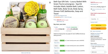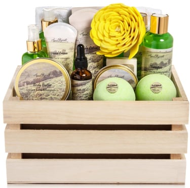 No More Dealing With - bath gift sets that are smaller than you expect and cheaply made. Our spa baskets are perfectly sized for gift giving. (See dimensions in the pictures.) Each bath kit comes with a delightful assortment of luxury at-home spa products: Body Wash, Bubble Bath, Bath Salts, Body Lotion, Bath Bombs, Body Scrub, Body Butter, Bath Soap, Perfuming Mist, Bath Oil, Hand Cream, Shampoo, Bath Puff, Bath Towel, & Cute Bath Tub.