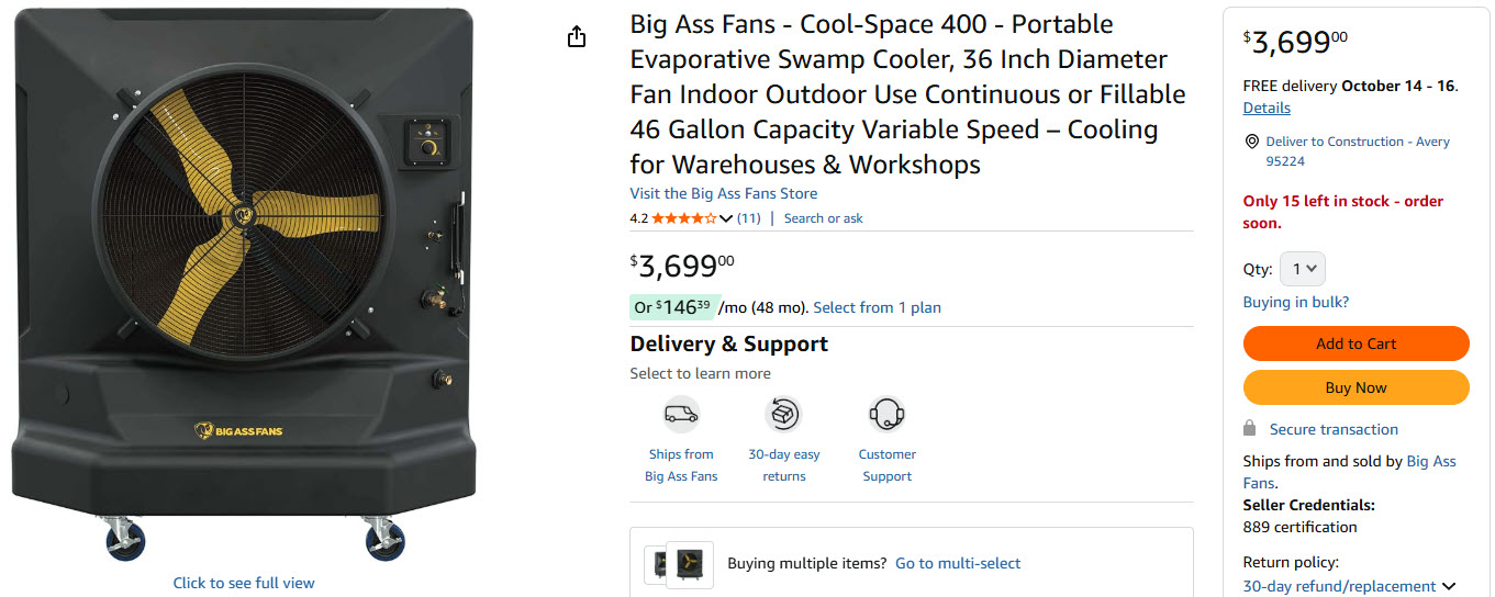 Efficient Cooling for Workspaces: Cool-Space 400 Evaporative Swamp Cooler is ideal for workshops, garages, and studios up to 3,600 sqft (334 sqm). Cool-Space 400 Evaporative Cooler rapidly cools air by up to 33 degrees, depending on ambient conditions, with a 36-inch fan and airflow ranging from 6,400 to 9,700 cfm, ensuring efficient cooling for various spaces