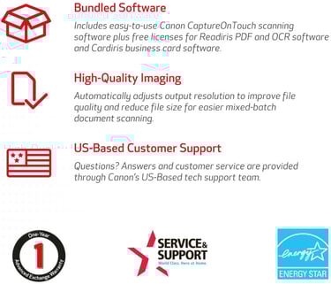 Bundled software: Includes easy-to-use Canon CaptureOnTouch scanning software (Win and Mac) plus free licenses for Readiris PDF and OCR software and Cardiris business card software (Win)