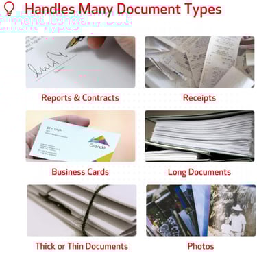 Reliably handles many different document types: Receipts, photos, business cards, reports, contracts, long documents, thick or thin documents, and more
