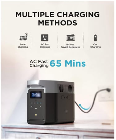 1.8 Hrs to Full Charge. EcoFlow's patented X-Stream AC fast charging lets you recharge DELTA Max in only 1.8 hours. Or even quicker if you combine any two charging methods, that's from an AC wall outlet, solar panels, or a Dual Fuel Generator.