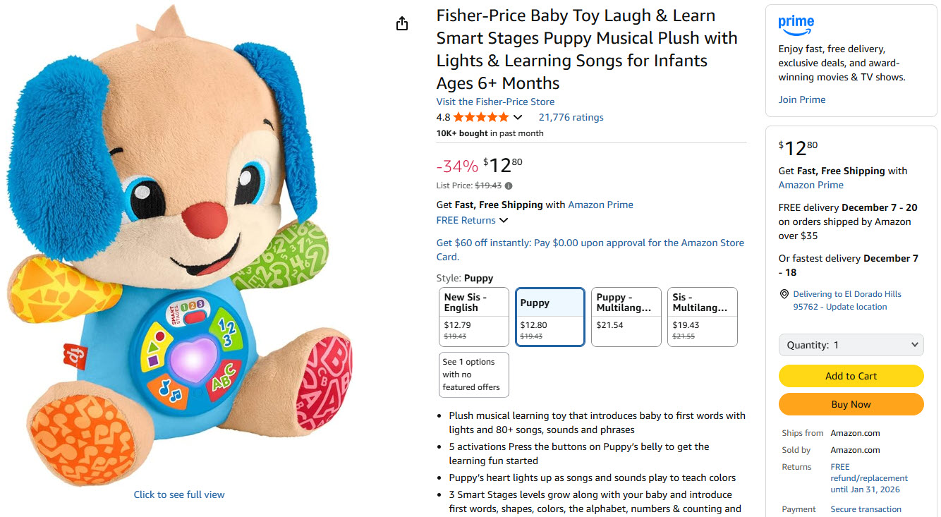 If you’re looking for the perfect baby learning toy, the Fisher-Price Laugh & Learn Smart Stages Puppy is one of the best educational toys for ages 6–36 months. This soft, plush puppy doesn’t just look adorable — it actually teaches while your baby plays and cuddles.