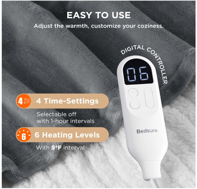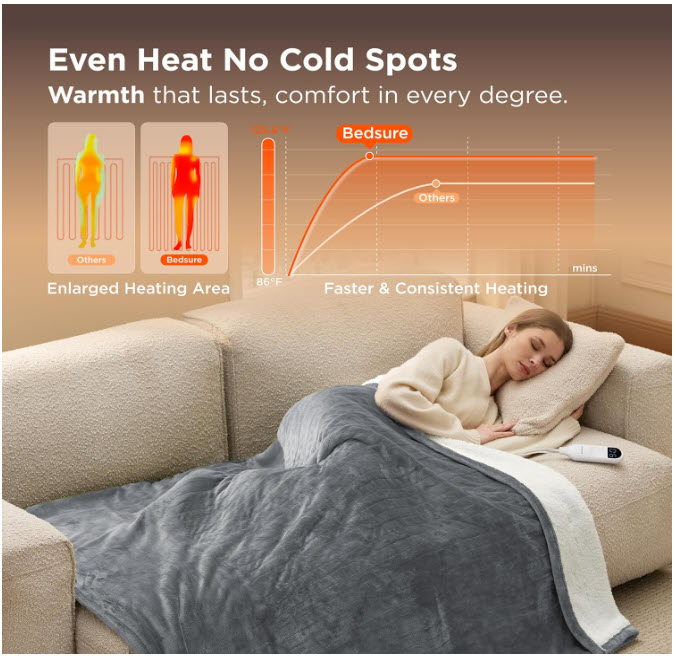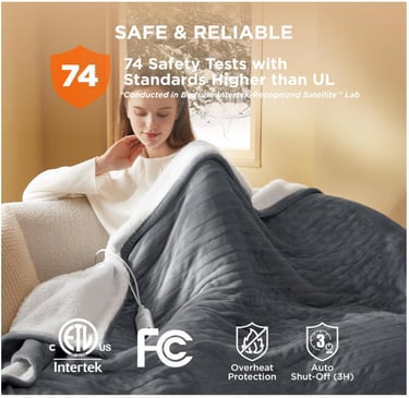 Safer & More Reliable: Tested in Bedsure’s Intertek-recognized lab with 74 safety checks that exceed UL standards, this ETL and FCC-certified heated blanket ensures dependable performance. The 3-hour auto shut-off prevents overheating, giving you peace of mind and making it a thoughtful gift for any household