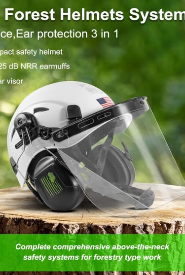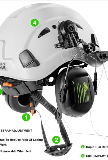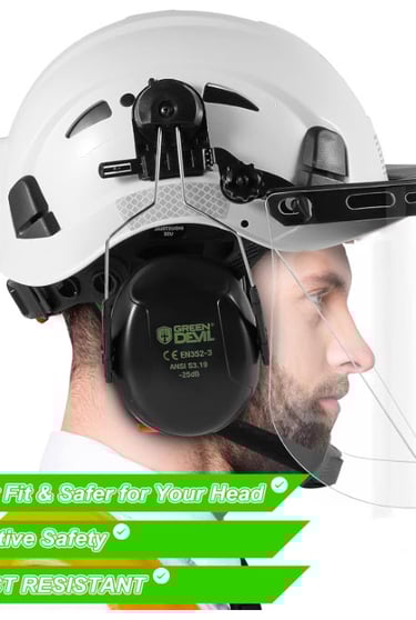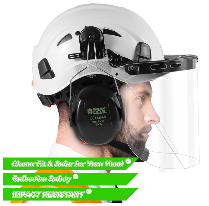 【Forestry Helmet System with Accessories】:GREEN DEVIL 3 in 1 safety helmet comes with ABS helmet, adjustable/removable earmuffs, and clear full visor, providing dynamic protection for any job.Equipped with a pair of 25 dB NRR earmuffs that help block out tool and engine sound noise for hearing protection.Easy flip-up clear polycarbonate face shields protect your face while giving you crisp vision.The accessories is easy to assemble,come with detailed installation instructions.