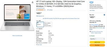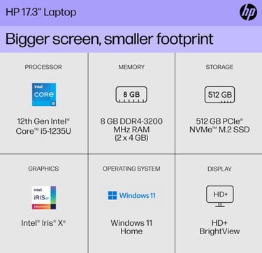 HD+ Display, 12th Generation Intel Core i5-1235U, 8 GB RAM, 512 GB SSD, Intel Iris Xe Graphics, Windows 11 Home, 17-cn2099nr (2023),Silver