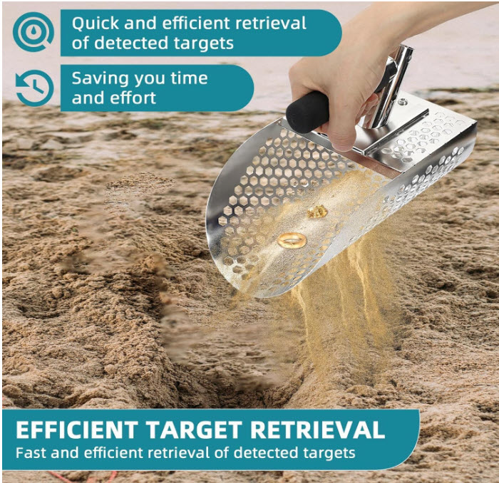 Quickly scoop, shake, and sift. The holes release sand while keeping valuable items like coins, jewelry, and relics inside. Ideal for fast target recovery.✔ Multi-Scene Use