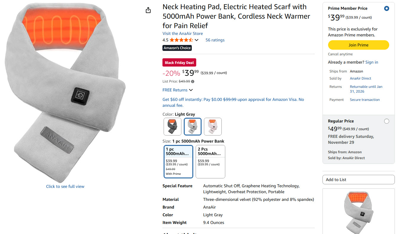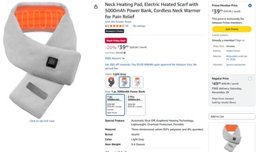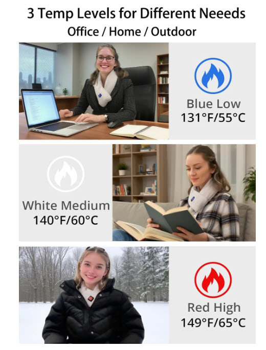 SAFTEY MEETS COMFORT: Unlike bulky heating pads, its scarf design wraps snuggly around your neck, easing tense muscles. It shuts off after 60 minutes; long-press the switch for 3 seconds to restart. No overheating, just cozy relief.