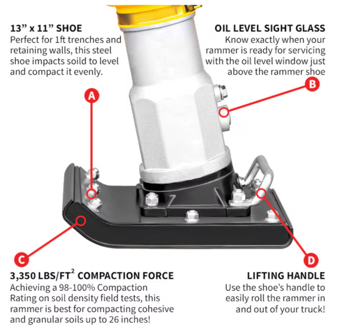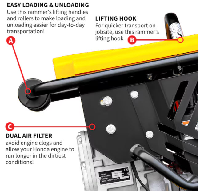 Equipped with a laminated 13" × 11" steel/wood shoe, it delivers up to 3,350 lbs per square foot of compaction force to densify soil, gravel, or base material. Its compact size makes it well suited for tight areas where larger compactors can’t fit. The unit comes with a wheel/trolley kit for easier transport on site.