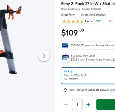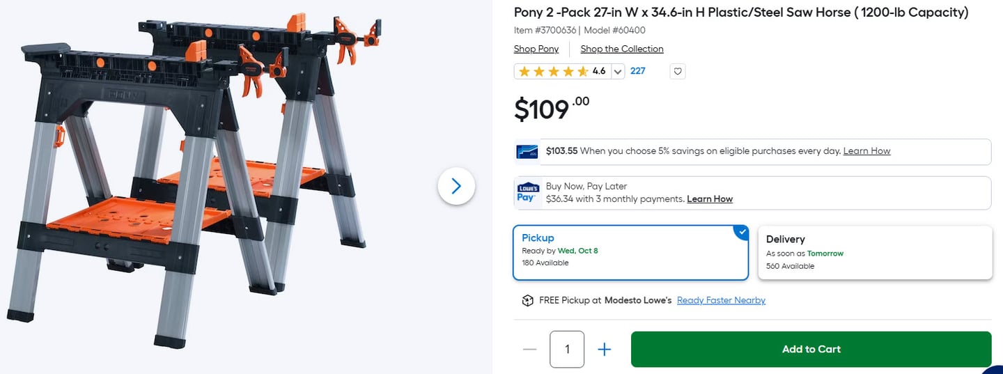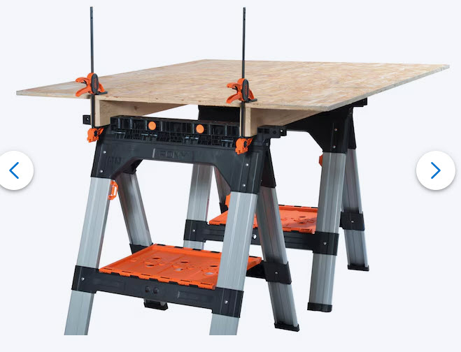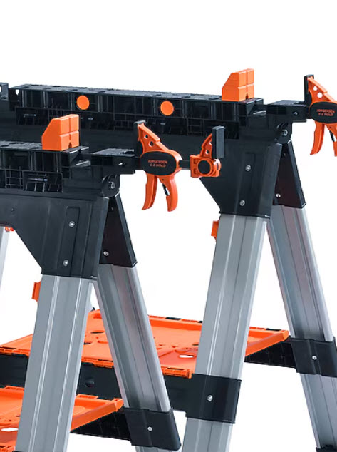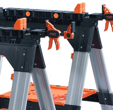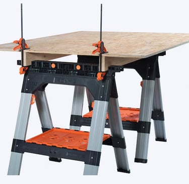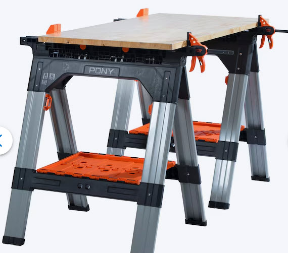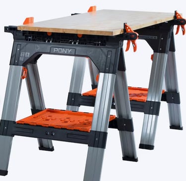 Durable and dependable, this Pony 2-pack sawhorse set combines steel strength with lightweight plastic design. Each sawhorse supports up to 1,200 lbs, making them ideal for heavy-duty projects, framing, or workshop use. Foldable legs ensure easy transport and compact storage, while the wide stance adds stability for safer cutting and assembly work.