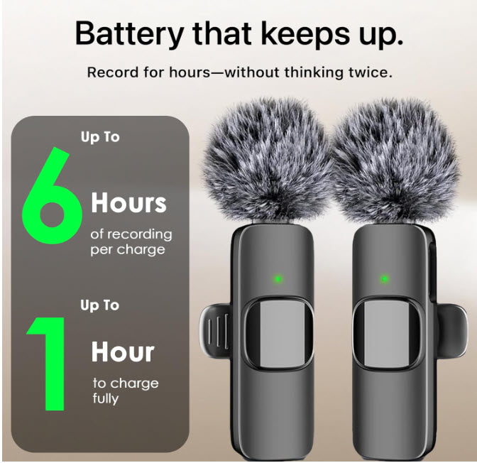 Rechargeable Battery: A wireless lavalier microphone designed for real creators. Record for up to 6 hours per charge. While using the lav mic, you can charge your device simultaneously!