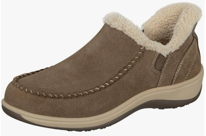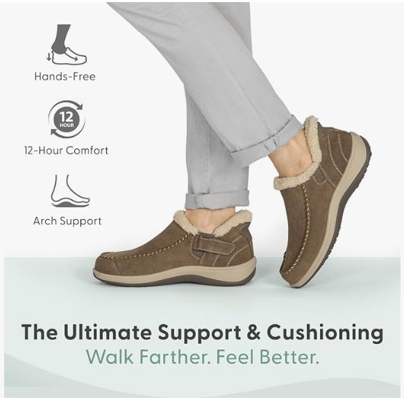 Orthopedic women's slipper designed with patented slip-on technology for hands-free on & off ease