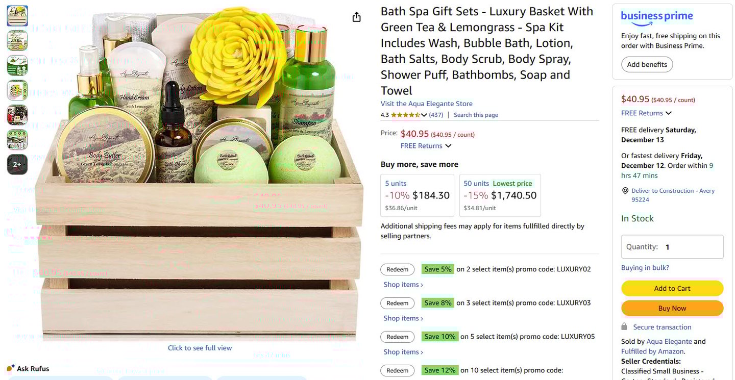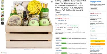 No More Dealing With - bath gift sets that are smaller than you expect and cheaply made. Our spa baskets are perfectly sized for gift giving. (See dimensions in the pictures.) Each bath kit comes with a delightful assortment of luxury at-home spa products: Body Wash, Bubble Bath, Bath Salts, Body Lotion, Bath Bombs, Body Scrub, Body Butter, Bath Soap, Perfuming Mist, Bath Oil, Hand Cream, Shampoo, Bath Puff, Bath Towel, & Cute Bath Tub.