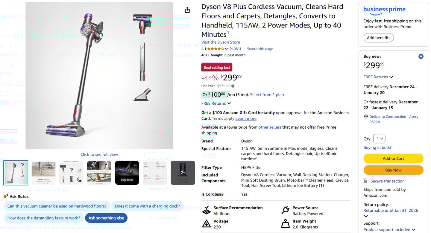 Dyson V8 Plus Cordless Vacuum, Silver/Nickel