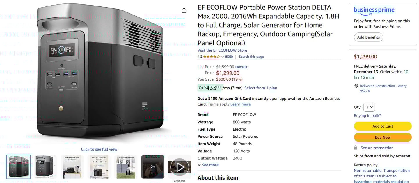 Solar Charge in as fast as 2.5 Hrs. Connect solar panels of up to 800W to keep DELTA Max running even when there's an outage. Compared to gas generator, the cost of gas, noisy operation, maintenance make DELTA Max a good long-term investment.