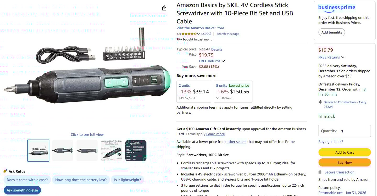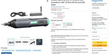 Includes a 4V electric stick screwdriver, built-in 2000mAh Lithium-ion battery, USB-C charging cable, and 9-piece bits and 1-piece bit holder