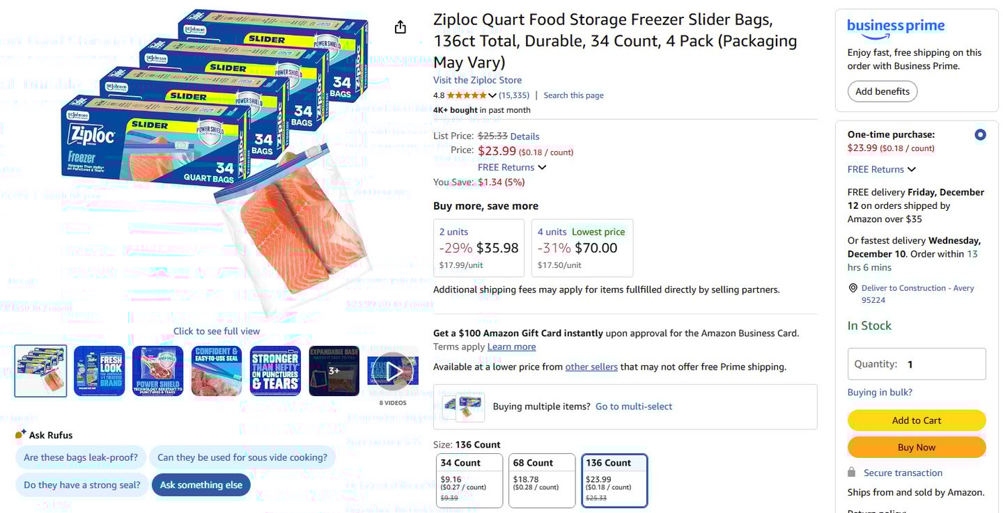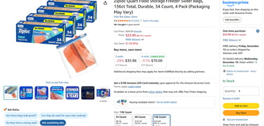 Four 34 count boxes of Ziploc Quart Food Storage Freezer Slider Bags to preserve your favorite flavors and foods in the freezer